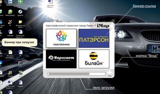 Включает четыре баннера, появляющихся при загрузке программы iMap и исчезающих только при нажатии кнопки «Вход», что обеспечивает 100% внимания к рекламе.